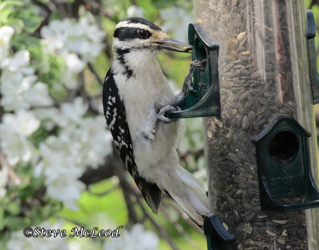 In the above pic with have a female hairy woodpecker filling up with sunflower seeds to take back and feed to her young. Both her and the male have been busy doing this for several days now. They have also found that peanuts work great as well.