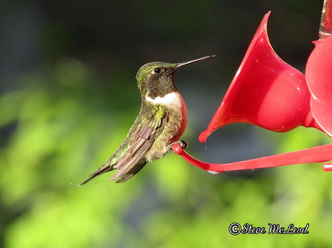 And there’s the male ruby-throated hummingbird again. But as soon as I bring out my camera and aim it his direction…zoom, he’s gone. He comes to the feeder about every 15 to 20 minutes in the morning, less as the day gets warmer. Such tiny birds, only about 3.5 inches (8.9cm) from tip of beak to end of tail and weighing only 1/8 ounce (3.1 grams). But such an amazing little bird and so beautiful. A great start to another wonderful day here at Steve’s Country. Now, while I get some more coffee, let’s take a look at today’s pics. The top pic, of course, is our main subject of the day, a male ruby-throated hummingbird at the feeder. His throat looks black because the sun is shining on his back, when the sun shines on it’s throat it will be a bright red.