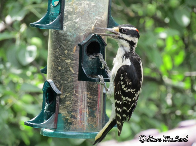 Or this male hairy woodpecker on another feeder eating sunflower seeds. Not exactly normal either. He does look happy though. And it does make things fun anyway! I hope you all have a marvelous Monday and God bless!