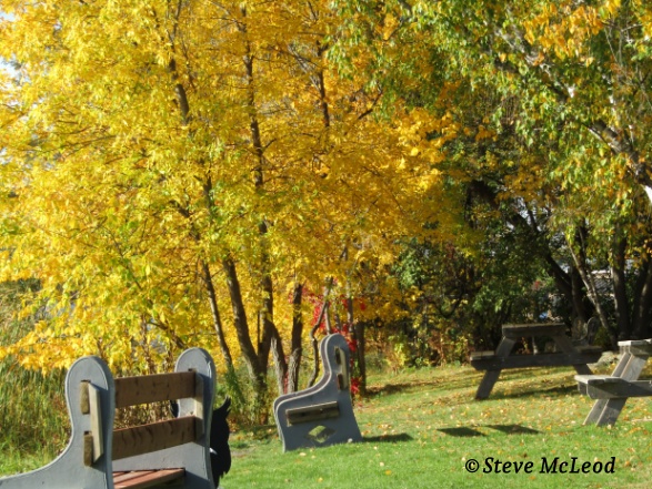 Well, we have some more fall color for the featured image. No, the picture isn’t crooked, the benches and tables are on the side of a hill. I’m not sure how they expect people to sit on that one bench without sliding off however. And in the pic above is a purple petunia from my little deck container garden, which is all gone now. Summer flowers are finished for another year. The sun is shining beautifully on those golden leaves, a beautiful fall morning indeed. Happy Friday everyone and God bless!