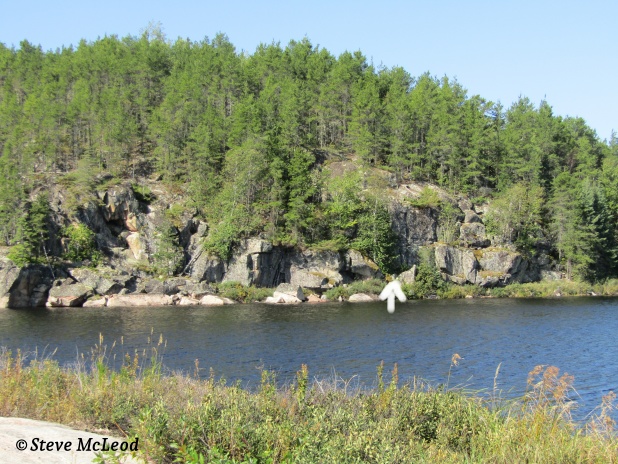 We brought our coffee with us to have once we got to the top. Once there we walked over to find where the stairs led to, which was easy enough. At the top of the hill it was nice and flat, kind of, and there were the remains of several large dirt foundations. Almost looked like a little townsite was once here. Obviously it wasn’t for the railway since it was on the wrong side of the lake. It could have been an old mining camp, though we couldn’t find any sign of mining activity. Possibly an old logging camp, though again it seemed like an odd spot. A good place to dig for old bottles was my thought. Dad didn’t think much of that thought. Don’t know why. “We don’t have shovels,” he said. “What do you think this is,” as I produced a regular shovel for dad and a small folding shovel for me.