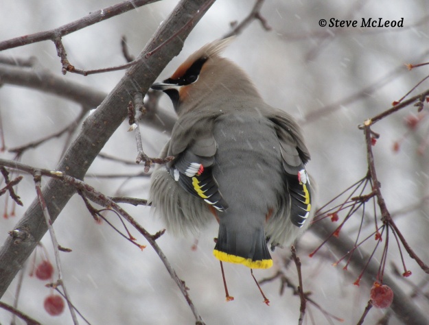 Jasper and Jenny haven’t been around yet, but I’m sure they will be here later this morning. Hmm, looks like the blue jays need some more peanuts, better toss some more out to them. Good timing, Jasper just showed up too, so more peanuts were definitely needed out there. I didn’t see Jenny anywhere, but maybe Jasper will take a peanut home to her, breakfast in bed on a cold winter morning. Well, it could happen. Today’s pics are a couple different Bohemian waxwings, there are a lot of them around this winter, even more than last winter. And I thought there was a lot then. The white streaks in the pics are snowflakes. Thanks for coming, have a wonderful day and God bless!
