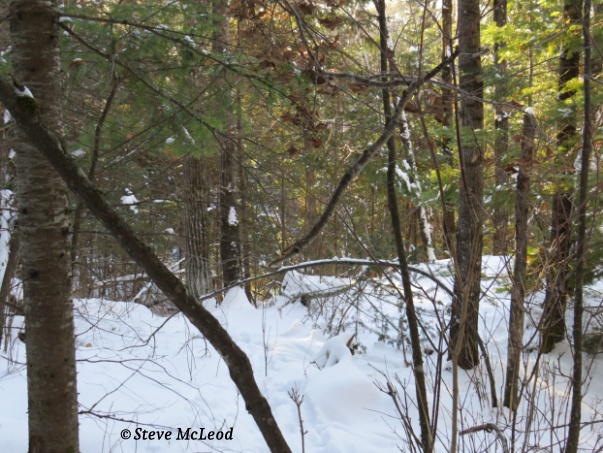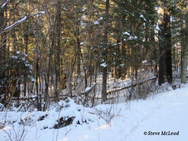 It was still so very silent, just me breathing that bitterly cold air. I hope my leg will hold up walking through that deep snow. I started down. Even though the snow was deep, going down was quite easy. But coming back up might be a problem. Well, once down I knew that going back up would be impossible, so which way to go? Going to my left the hill gets worse so I decide on going to my right. The railway tracks were close by so I went over to them where the walking would be easier. It wasn’t long and I discovered a very easy way up the hill. I put on my snowshoes, hoping the broken one would survive the trek back, and on I went. The climb was really quite easy, first going through a nice area of spruce trees where the snow wasn’t so deep. As I got closer to the top it once again changed to mostly red pine with a few jack pine as well. I stopped and listened.