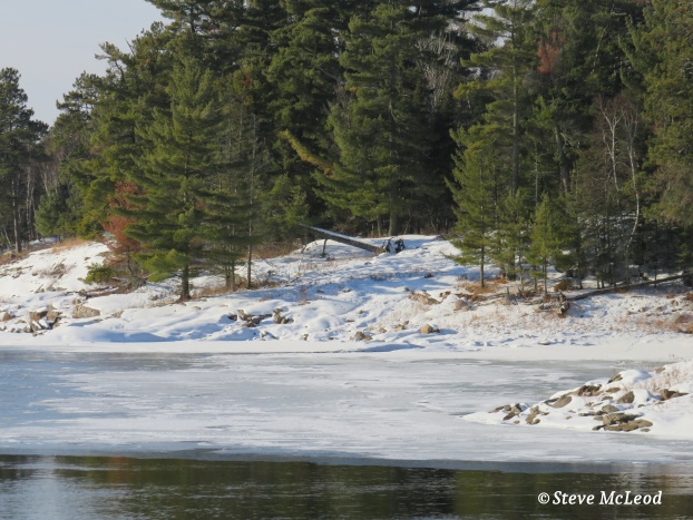 I heard some birds, chickadees in fact. Plus I could hear a woodpecker somewhere close by so I looked around. Finally I spotted it, a nice northern three-toed woodpecker. That’s the hardest woodpecker to see up around here. They like to stay deep in the forest away from people. He was busy at a pine tree, looked like he had found his lunch. I continued on. My leg was starting to pain a little now so I stopped for a bit sitting on a large rock, after brushing the snow off first. A raven flew overhead following along the railway tracks. I didn’t stop too long and off I went again. Soon I was at my trail and heading down to the lake. Once out on the lake a ways I took the snowshoes off since the snow wasn’t deep. I figured I would make better time without them and it would be easier on my leg. It was late afternoon by the time I got back, but the sun was still shining, though just above the trees. All in all it was a beautiful day, even if I did break my one snowshoe.