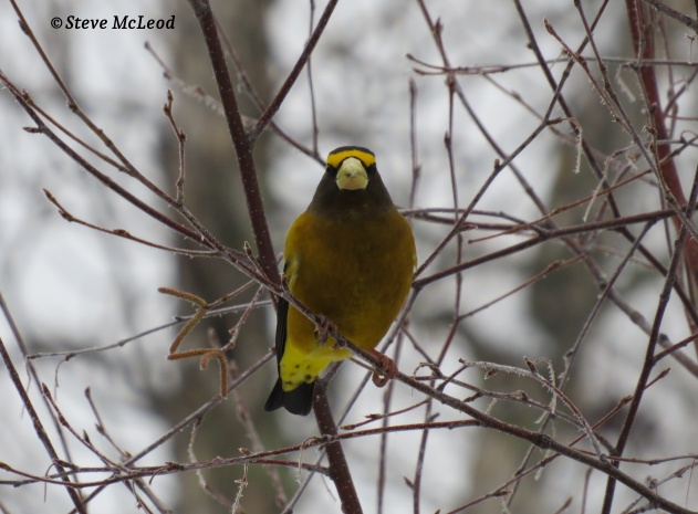 Theodore, my wild turkey friend, was here again this morning. I was beginning to wonder if he was going to come back, it’s been 12 days since his last visit. He ate his fill of sunflower seeds and then left. I think he must be getting fed somewhere else that he likes better. He would probably enjoy a mix of grain. Oh well, it’s nice that he shows up anyway. The evening grosbeaks are here now, and the blue jays. Those grosbeaks are doing a lot of arguing this morning for some reason. And there they go. They flew a long distance that time. There’s nothing around to actually scare them, but that’s the way these birds are, they just suddenly fly. But they’ll be back after a while, they haven’t finished their breakfast yet.
