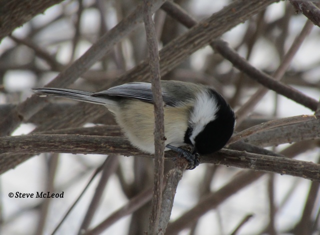 I know many of you are unfamiliar with such temps, and believe me, you don’t want to feel them either. It is just unbelievably cold. It’s amazing my little bird friends can survive such temps, like my favorite, the black-capped chickadee. They are small, only 5 to 6 inches (12-15cm) from bill to tip of their tail and 2 to 2 and a half inches (5 to 5.5cm) is the tail. In this cold their hide their legs and feet under their feathers as often as possible, actually all birds up here in the north will do that.