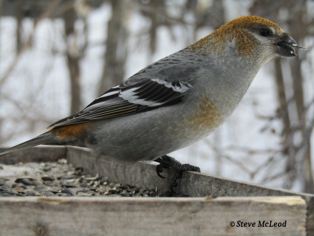 Hi there and here we are with our sixth bird of the day and today it’s the female pine grosbeak. She is actually quite beautiful with her gold coloration which really sparkles when she is in the sun. Pine grosbeaks are quite tame and tolerate the smaller birds, such as redpolls, who are often on the feeder with them. They are only in our area during the winter months and usually head back further north in March. Enjoy your day and God bless!