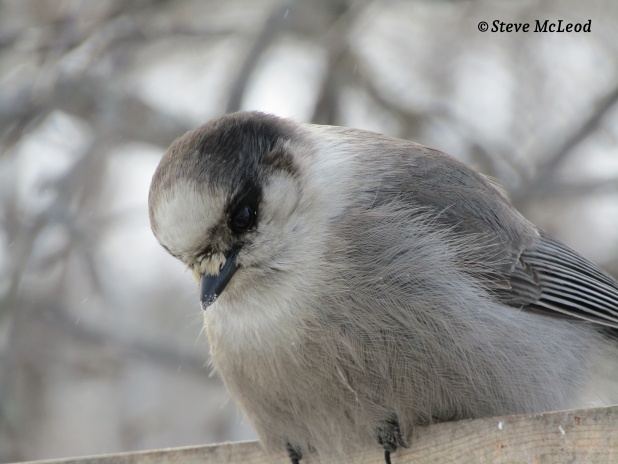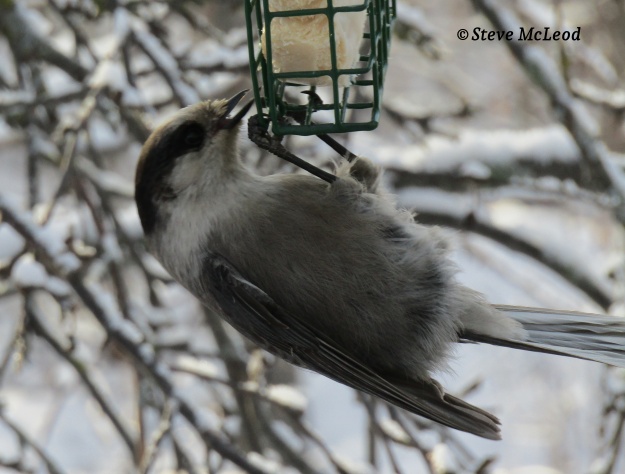 Well, back to our friendly gray jays. We saw yesterday that they nest very early, starting with nest building in February. They are able to nest so early in the season because of the large number of food caches that they hid among the trees the previous summer and fall. And actually because they nest so early they are able to start hiding food in the spring, so that they have abundant food to eat and to feed their young during a time of year when food is amazingly scarce. Unlike other jays, these gray jays don’t eat seeds or nuts so they rely heavily on their food reserves and anything else they might be able to pick up during the winter months.