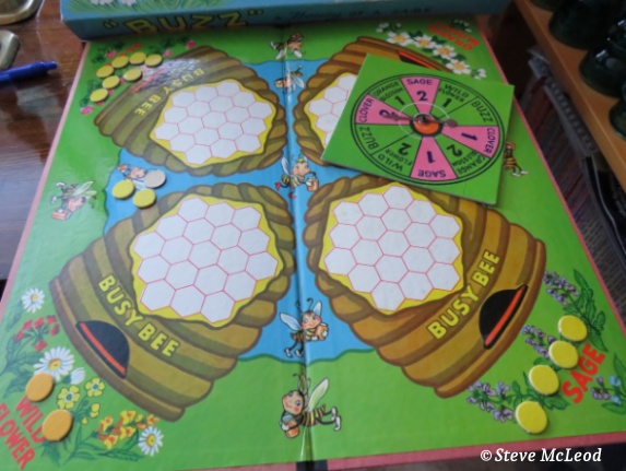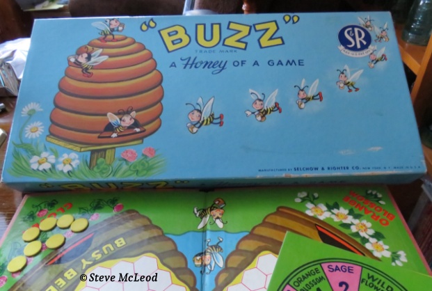 Then we have the game of “Buzz”. This is mainly a game for younger players, this one came out in 1955 and cost $1, and there were 3 other similar games in the series. Each player has “loads” of honey, little cardboard discs and players would take turns with the spinner. If, for example, you were ‘clover field’ and the spinner landed on ‘clover 2’, you could then put 2 loads of honey in your hive. However, you could also lose turns and others could take your honey as well. So it wasn’t just simply filling your hive, the game could take a while to complete. This particular game doesn’t look like it was used much, about the only thing that shows any wear to it is the spinner. It would actually be fun to have a vintage game night with adults playing some of these simple games, it might be quite fun! Anyway, that’s it for now, I hope you all have a wonderful day and God bless!