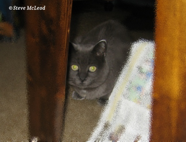 Suddenly Mr. Cat yowled and Calanthe screamed at the same time! Muffin was in the hall so fast and “Thwock!” and a loud groan. Mr. Cat was laying on the floor bleeding. “Stay with him Muffin,” I said while rushing out the door with my gun ready. I went to Calanthe who was also laying on the floor gasping. She had obviously been choked, possibly by the same man who choked me? I take her back to the cats. Meow,meow.=I hit ghost man right between shoulders, no time to aim. “That’s okay Muffin,” I said, “you could have killed him there anyway, that’s right at his heart. But where did he go?” Meow,meow.=He just disappear. “I’m not sure either,” said Calanthe through tears, “I, I think it was Karl.”