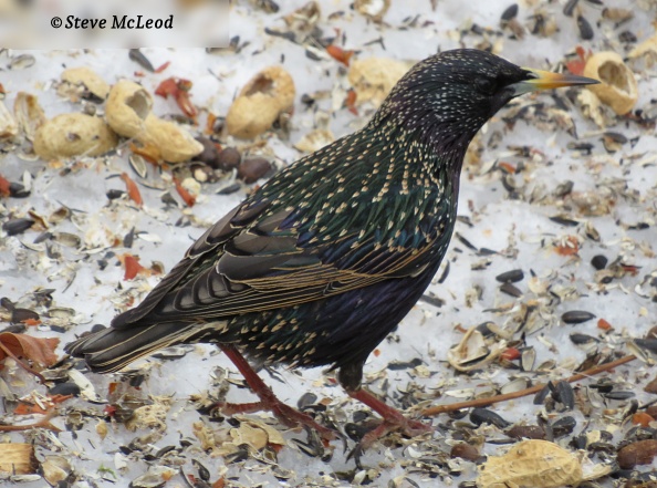 Hi everyone and welcome to our bird of the day which today is the European Starling. My picture is of a starling still changing into it’s spring and summer plumage. It will get a completely yellow beak and orange legs and feet. And most of the spots will disappear leaving them with dark glossy iridescent brown feathers. All starlings in N.A. are descended from 100 let loose in New York’s Central Park in the 1890s and now number around 200 million thriving from Alaska and northern Canada down to Mexico. Though often considered a pest they are a remarkable bird able to survive in varied habitats. They can mimic 20 different bird songs. They are also strong fliers and can fly at speeds of 48mph (77kph). Oldest recorded starling in N.A. was 15 years, 3 months, a long time for a small songbird. Have a great weekend everyone and God bless!