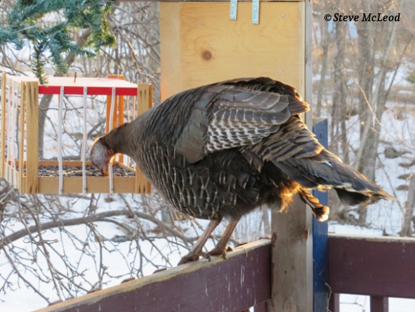 Good morning everyone! It’s a beautiful morning here at Steve’s Country. The temp is 32F (0C) and with no wind it feels very nice outside this morning. Theodore, oops, I need to change her name to Theresa since it would appear that she’s a female. At least the one that was here this morning. From what I have read about wild turkeys, it can be difficult to tell who’s who at times, especially if it’s a young male or older female which can look very much alike. Their droppings however are supposed to tell the difference easily, which means the one here this morning is a female, but one that shows up is definitely a male. As we get a little closer to mating season then other differences should show up as well, especially with the wattle. Chickadees showed up next. Then nuthatches and blue jays were here about the same time.