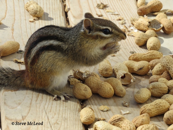 No one is here right now. It has been an odd year for the birds coming to the feeder. Jasper came for some food too. And so did Coffee. Jasper spotted Coffee this time. His eyes got all bulgy, he did his little squirrel dance, something they do when excited, and he chirped. Coffee stopped filling up with peanuts and remained motionless. Jasper came down onto the deck slowly, remaining slow moving as he crossed the deck. Coffee took off and Jasper right behind him. Coffee made a quick turn around and Jasper tried but slid a bit giving Coffee a better lead. He went in behind some boxes on the deck.