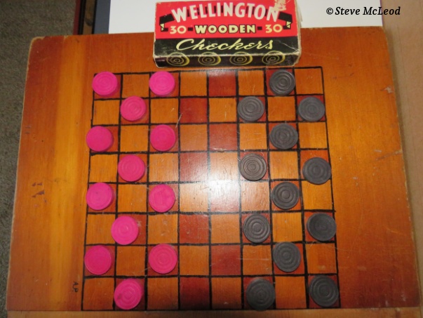 Regular: This is a checker board from about 1920, and it’s a slide in type. They used these in different places like old stores, taverns, etc. There would be a groove in the side of the table and this checker board would slide into that groove so that more people could participate in playing the game. At the bottom of the pic is the part that slides into that groove. The checkers themselves are from the 1950s and are wood.