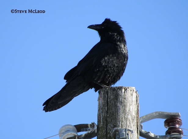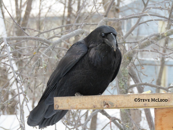 Hi everyone! Today’s bird is the “common raven” which is divided into 8 subspecies, the one in our area and most of Canada is the “northern raven”. This is also the largest of the group, weighs about 5 lbs (2.3 kg). It has a wingspan of 5 feet (150cm). They are also the largest songbird and are in the same family as crows, jays, magpies. Ravens are found in most any habitat and found all around the northern hemisphere. They live as far north as there is land for them to nest on. Both sexes build the nest but only the female incubates the eggs and the male brings her food. Usually 4 to 7 eggs are laid. Ravens will eat most anything, including plants if meat is scarce. They are sometimes mistaken for crows, but crows are only half the size. Ravens make a deep throated croaking sound. They are not easily scared by anything and are very intelligent birds. They are also important since they help to clean up dead animals along roads and in the forests, thus preventing the spread of disease. Generally though they are not a favorite bird for very many people, though it is an important bird for Indigenous people in many countries.