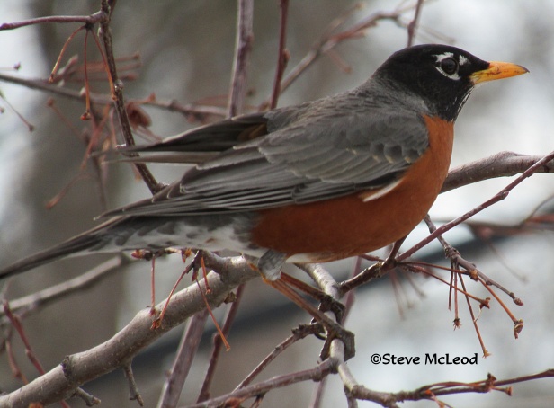 Hello once again! Today’s bird is the “American robin”. It was given it’s name by early settler’s who thought it resembled the English robin. But the American robin is not actually a robin, but a thrush and it is the largest thrush in N. America, about 10 inches (25cm) long. It is also perhaps the most well known bird in N. America and one of the most widespread. It breeds all over N. America from Alaska and the northern tundra regions of Canada down to Mexico. It will raise 2 and sometimes 3 broods per year, even this far north. Usually 3 to 5 eggs are laid each time, but only about 25% of the young will survive until November. Yet it is one of the most numerous birds on the continent. Although birds can live up to 14 years, few do so and on average there is a complete changeover of the population every 6 years. Few robins actually live longer than 2 years. They have many enemies, most notably hawks, owls and ravens. But robins are very adaptable birds, originally a forest bird they can now be found everywhere except in marshy areas. They have a cheerful song and are one of the earliest birds to return in spring. They are also the first bird to sing in the morning, normally while it is still dark, and the last to sing at night, well after darkness has come again. They will build their nest most anywhere and often pick some very odd nesting places. They average 180 trips a day building their nest. Both parents look after the young.