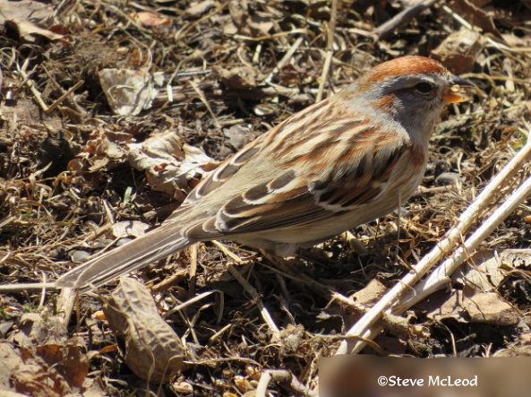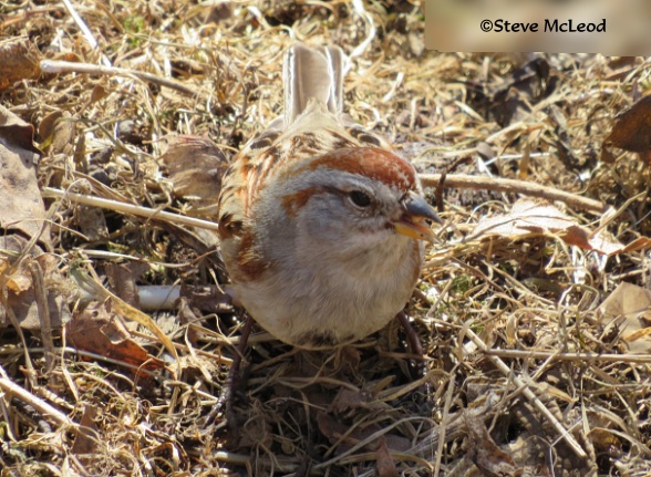 Hi everyone! Today’s bird is one I have been trying to photograph for 4 springs now, the “American tree sparrow”. This little bird is a beautiful mix of browns, black, white and gray, with a black spot on his chest, just noticeable in the pic above. These birds eat 30% of their weight in food each day and 30% in water each day. A day without food means death for these birds. They breed in the far north at the tree line and even on the tundra. They are ground nesters, both help with making the nest and caring for the young. The female lays an egg each day, or every other day, until there are 4 to 6 eggs, but they all hatch within hours of each other and not necessarily in the order they were laid. They eat almost exclusively insects during the summer, in fall and winter nearly all seeds. They can live up to 10 years, the oldest recorded is 10 years 9 months from a bird that was banded. They are mostly a ground bird and readily adapt to being around people and are easily attracted to feeders. They winter from southern Canada to the southern parts of the US. Females and young tend to winter further south than males.
