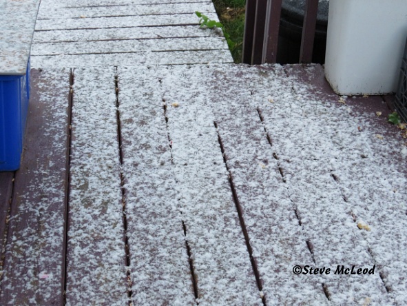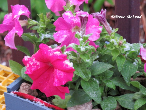 But on the deck, on plants, trees, the snow remained for about 2 hours, then it started to rain again. We also got some freezing rain overnight so my plants also had ice on them. However, water is good for protecting the plants from frost. Spraying water on plants before the frost hits will protect them as long as it’s not a real hard frost. When water freezes, it produces heat which helps to protect the inner cells of the plants, keeping them from freezing. But if you can’t do it before, spraying water on the plants after being hit with frost should also help prevent frost damage. Again, providing it’s not a hard frost and providing you can water them before the sun hits them.