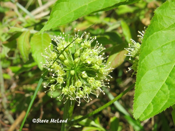 Hi everyone! Today’s wildflower is the “wild sarsaparilla”. It’s flowers form a globular cluster from 1 to 2 inches (2.5 to 5cm) across. Each individual flower is about 1/8 inch (3mm) across with 5 petals that curve backward. There are also 5 white tipped stamens coming from the center of the flower. Each flower stem has usually 3 clusters of flowers and are normally hidden under the plants leaves with come up on a separate stalk. This is a native wildflower that grows in shade or partial shade in wooded areas. The plant grows up to 2 feet (60cm) tall and blooms in May to June. It produces a dark purple berry from each flower which are edible, but best cooked in jams or jellies. They can be found right across Canada and the northern half of the US, further south in the east to Georgia. Well, I hope you have a wonderful day and God bless!
