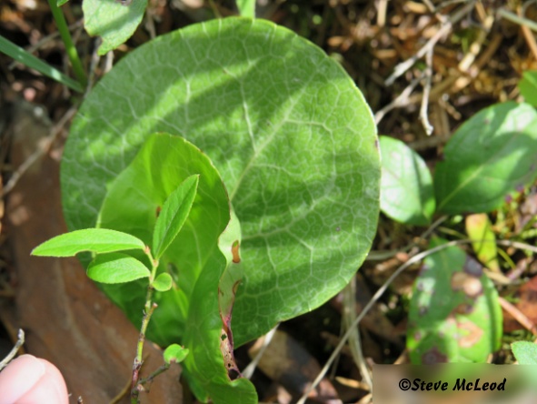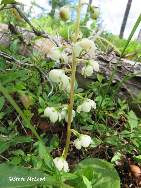 Hi everyone! Today’s wildflower is an interesting one that we don’t see too often, the “round leaved pyrola”. There are several different species of pyrola and we have at least 4 of them in our area. This is a native wildflower which likes dry woods under stands of red or jack pine trees. This is the first time I have seen this one in several years so it was nice to get a picture of it. I had to lie down on my stomach to get the picture since the flowers hang down. The flowers can be waxy white, greenish white or cream colored. They prefer partial shade to shady areas and grow up to 20 inches (50cm) tall, though mostly around here they seem to be 6 to 10 inches (15 to 25cm) tall. The leaves are quite round and can be 1 to 2 inches (2.5 to 5 cm) across. They bloom from June to July and are not generally found in large groups of plants, but are usually more spread out. At least in our area that’s the way they are anyway. In Canada they can be found from Manitoba to the east coast, in the US from MN to TN and across to the east coast.