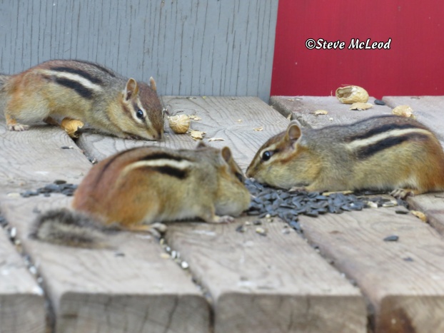 The chipmunks were quite late getting here this morning but there are now 4 of them eagerly filling their cheeks with sunflower seeds and peanuts. So interesting to see the chipmunks and blue jays together. The chipmunks don’t back down, even when chased by the blue jays, but they do stay on guard around them. But with some blue jays they are very relaxed and will sit there quite peacefully next to the blue jay as they both fill up with the sunflower seeds. In between the white-throated sparrows, there are lots of them now, will try to get in there and grab a sunflower seed or even a partially broken open peanut.