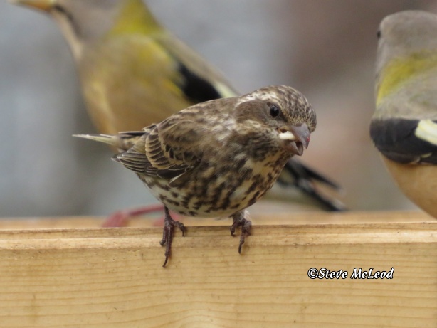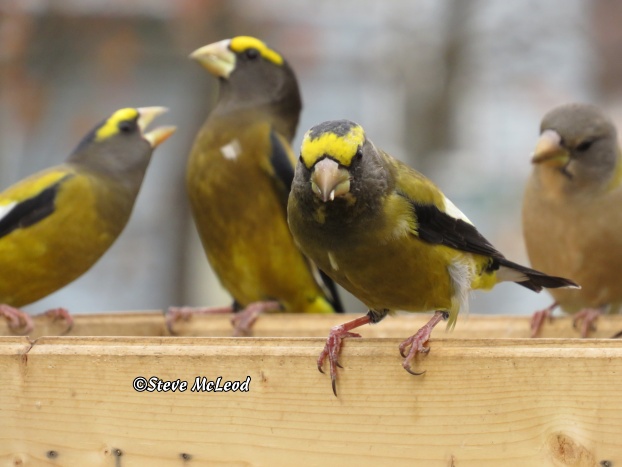 Good morning everyone! It’s another nice, clear morning with a temperature that is just about right at the freezing point. So there is some frost out there again. I stood out there for a while and watched as the birds started coming in. Those evening grosbeaks come from different directions and from a long distance for some of them. The feeders right now are full and there are a lot of them waiting their turns, sitting in the trees. It’s quite interesting watching them eat those sunflower seeds. Those big beaks of theirs are perfect for breaking open sunflower seeds and they do it with great efficiency.