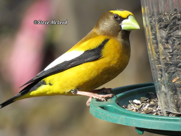 The purple finches left at the same time, I was hoping they would stay around for the winter, but I guess they didn’t like the idea. But, they don’t always stay the winter, they are a bit unpredictable that way, like a lot of the finches. Most of the evening grosbeaks have gone too, there is about 30 of them out there this morning, down from their high of more than 100. But the smaller birds are increasing in numbers slightly. There are about 2 dozen chickadees now, 4 white-breasted nuthatches and 3 red-breasted nuthatches. My lone pine siskin seems to have gone too, plus the redpolls.