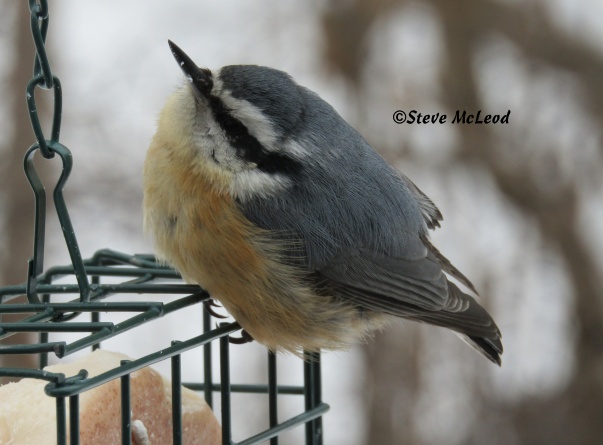Hi everyone! Here we have a very cold red-breasted nuthatch taking a break from his breakfast to warm his feet. It is amazing how much these little birds can puff themselves out. Have a nice warm day and God bless!