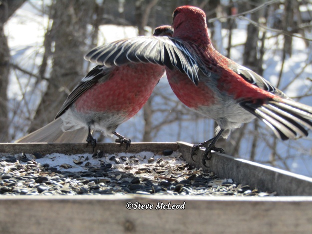 Hi everyone! Muffin here again with another photo pick from my human’s collection. This one is 2 male pine grosbeak’s having an argument. My human standing next to feeder. Birds have such funny names. They not look like pine trees. Pine trees green, these birds red, very strange. Hope you have nice day!