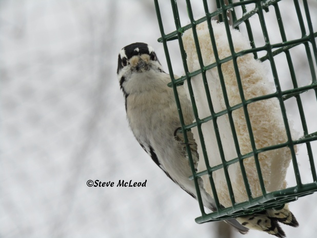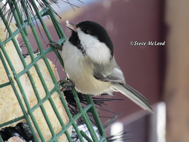 They work good together so nothing is wasted. There is a little chickadee in their favorite bush opening a sunflower seed, well, actually there are several chickadees in that bush. Anyway, this one is pounding away at his seed, but he drops the seed after breaking open the shell and he dives down after it, catching it in mid air before it hits the snow. To these little birds, food is a valuable resource and they don’t want to waste any of it. Even if it drops in the snow, they will still dig around for it.