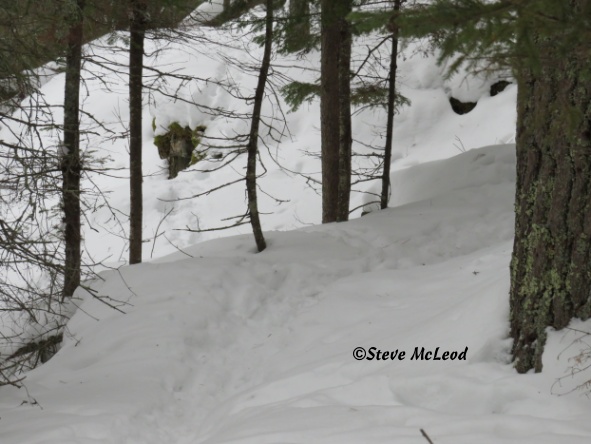 However, in one direction there are a lot of smaller spruce trees and a tangle of shrub branches. That is where the sound came from, and it sounded like growling. But when I stopped I could see or hear nothing. Then, just before continuing my walk I heard it again. It was definitely a growling sound, but I still could not see anything. But I had my camera ready just in case. There was no one else around so it had to be a wild animal, but I don’t know why it was growling. But I heard nothing more so I continued my walk. The foot path that goes off the main path was a bit more used than before but still a lot of loose snow.