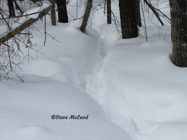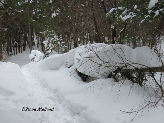 We have much more snow than normal on the ground right now, and we will likely get more yet. So the river will be high this spring, unlike last spring. Even now the river is high and turbulent, with heavy swirls of current as the water moves past. I did not stay there long and headed back home. I measured the snow in places, between 3 and 4 feet (90 to 120cm) deep. I fell twice on the walk, at the same spot, going in and coming out, even though I was trying to be extra careful right there. The fall coming out was the worst and I am still feeling it today. I have an idea for getting past that spot next time.