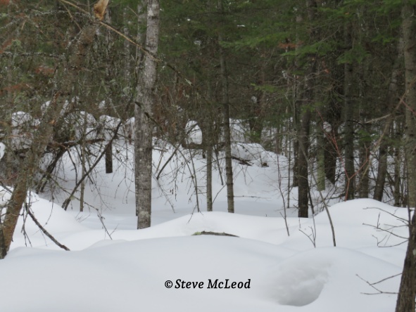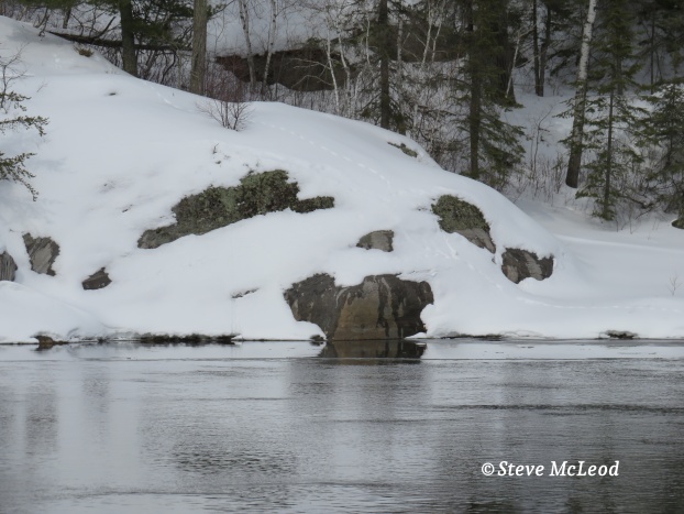 There were a lot of chickadees and nuthatches all along the path right to the river which gave me a good indication just how many of these birds were visiting my feeders this winter. I heard a couple of squirrels along the way, but not Scramble. There were no fresh squirrel tracks in the snow around where he lives, but perhaps he has moved to a different part of his territory for now. I left him some peanuts on the way in and they were still there when I came back. I saw two deer, undoubtedly ones that come here.