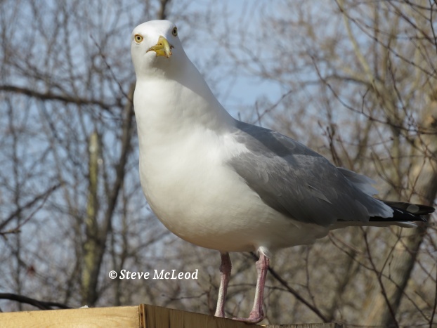 So I took some food out to them and they both came down to the feeder right away and were not the least nervous about having me stand out there talking to them. It was like they had never gone. I am showing a photo of Sir George. They are herring gulls, a very large gull and the largest we have in this area. Herring gulls generally come back first, followed by the ring-billed gulls, a much smaller though almost identical twin. Those are the only two gulls we have here.