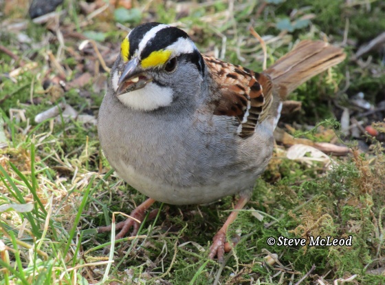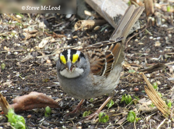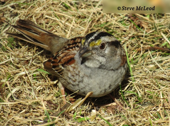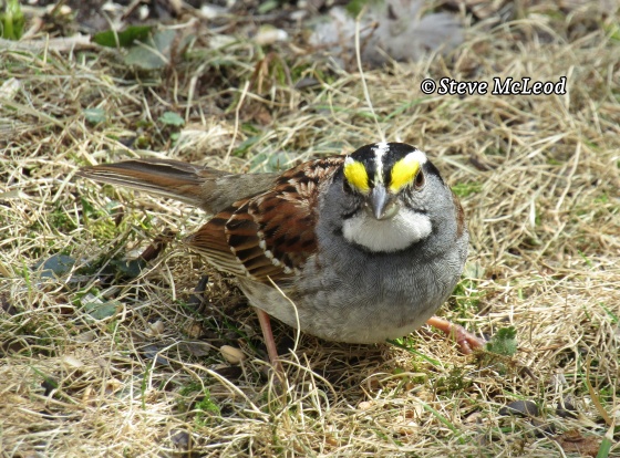 Another white-throated sparrow in a different color variation. It was once thought these were females, but males and females can be found in both color variations.