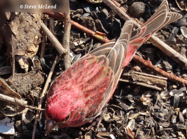 I thought today we would take a look at this photo of a male purple finch. It not only shows off his nice red color, but it also shows the beautiful pattern of his feathers from directly above this beautiful bird. He was on the ground next to my deck so I could just look down on him and get this photo. I love the patterns that can be seen in birds feathers and often we do not see them from above which makes this one so interesting. Hope you enjoy it too! Have a great day and God bless!