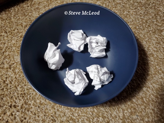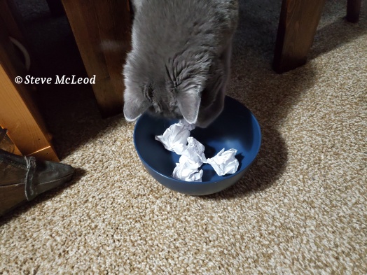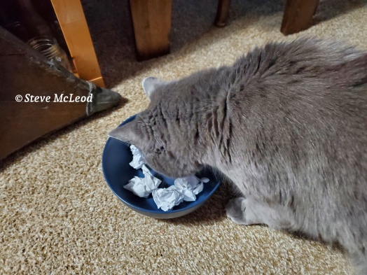 “Okay,” I said, “GO!” And she immediately ran around the table and came sneaking up on the bowl and scooped out one of the paper balls! And the winner is…