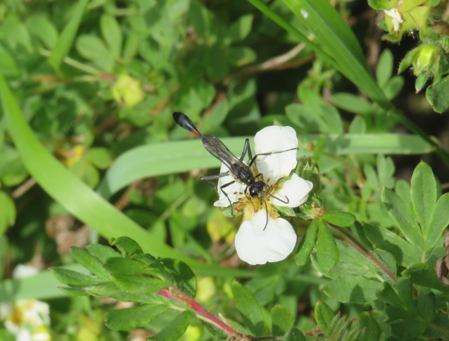 Welcome back to our insect series! Today we have the “Thread-waisted wasp, Ammophila species.” These are a solitary wasp that nest in the ground. They are about an inch (2.5cm) long and their waist is truly thin! Mostly they will eat nectar but their young need a caterpillar to feed on so the adult will kill a caterpillar and stick it in the nest for the young to feed on. They seem to be quite a friendly wasp though. They like the warmest part of summer to fly around. Have a great day everyone and God bless!