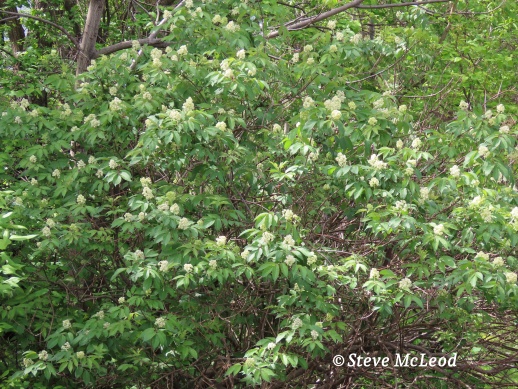 Oh look, there is a male ruby-throated hummingbird at the feeder. I always enjoy having them around. There are 2 males, but I have only seen 1 female. The red alderberry bush is in full bloom right now. Oddly I have not seen any bees at it yet. The neighbor’s mock cherry tree is also in full bloom and I hope to get a photo of it today while the sun is shining.