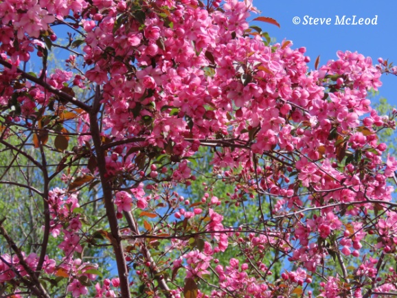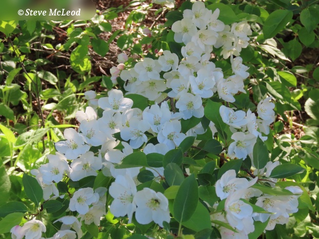 The pincherry is a native shrub, or small tree, that produces nice bright red berries, great for making jelly or syrup. The apple tree was likely the result of someone tossing aside an apple core and the seeds grew. I imagine the same happened for the cherry tree. Both were full of blossoms. So were the pincherry and Saskatoon bushes. In fact, everything was just loaded with flowers this year. I have not seen such thickly blooming blueberries in a long time.
