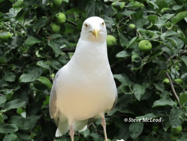 Hi everyone! My various herring gull friends always manage to give me a direct look now and then. This photo is not from this year however, a little early for those apples to be out. Besides, that old apple tree is no longer around after one of our bears pushed it over last year. It was not really very nice of him to do that, the birds enjoyed that apple tree. Well, perhaps the gulls are happy it is gone, now it is easier for them to take off from the bird feeder.