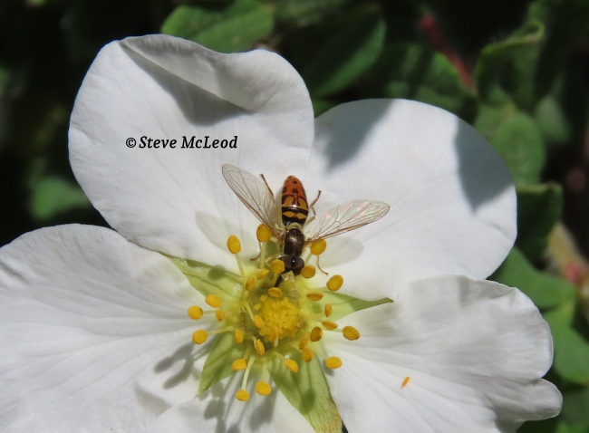 Well, this is the 4th in our series and the name of this little fly is “Toxomerus Marginatus”. It has a more common name too, “Margined Calligrapher”, kind of an odd name and a large name for a tiny flower fly. These little flower flies are about 3/16 of an inch (about 5mm) long. They are one of the most abundant of our flower flies and can be found most of the summer around here. This one in the photo is a female, I am still trying to get a picture of the male, which is not quite so abundant around the yard but hopefully I can get a pic of one soon. Have a great day everyone and God bless!