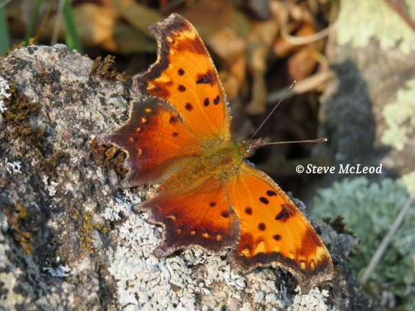 Today we have another butterfly to show you. This one is the “Gray Comma”, I guess because of the nice orange color. Actually, it is gray underneath and looks quite like a dried up leaf. This butterfly hibernates as an adult, this is the winter form most commonly seen in the earlier spring when they come out of hibernation. The summer form has more darker brown on the hindwings. They usually have 2 broods per year. They are a common northern butterfly but their range extends quite far south as well. The wingspan of this one is about 2 inches (5cm). They most often sit with wings closed, so I was happy to get this picture. Have a wonderful day everyone and God bless!