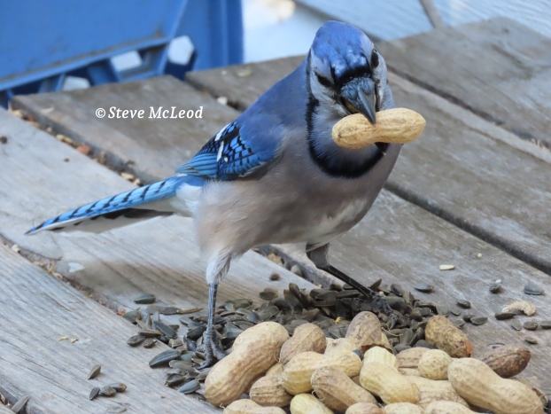 It was cool since I was sitting in the shade. The deck is mostly shaded all day long now because the sun is so low in the sky that it hides behind the trees, except for a couple of short intervals. The birds were busy, especially the blue jays who were coming down for peanuts steadily while I sat there taking pictures about 6 feet away. That is solitude. Some of them were a bit nervous and came in and out quickly.