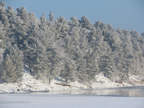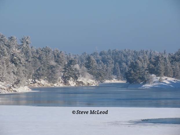 It has meant I have been able to get some nice frosty pictures, which I am showing again today. I hope you enjoy them. On one picture we see open water on the river on one side of a bridge, while on the other side of the bridge people are on the ice with their trucks, cars and fishing “shacks”, or “huts”, as they are called by people around here. Some are tents, some are wood structures that are towed onto the ice, one is a camping trailer.