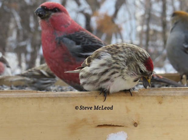 Another female Common Redpoll on the feeder, with a male and female Pine Grosbeak behind her.