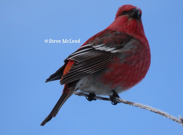 Now I make sure I have some peanut pieces to put on my hand when the chickadees and nuthatches are around. They only stay about 15 minutes, then they leave for a while. But there are other birds around now, like the pine grosbeaks. Most of those have headed on north now, but 5 are still coming. There were over 40 evening grosbeaks yesterday, but only 4 this morning, all females.