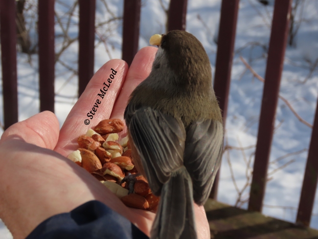 And there are 3 Red-breasted Nuthatches that will land on my hand, though one is still very nervous about it. The one Boreal Chickadee is amazingly brave now and was patiently sitting on the railing, waiting for me to get my box to sit on and get the peanut pieces on my hand. I barely sat down and he was on my hand. He will even land with his back to me now. That is solitude.