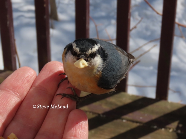 Chloe, the Boreal chickadee was there too looking for some food. I put some peanut pieces on my hand and called to her. She came right away when she saw me, landing on my hand, picking up a piece of peanut, said thank you and off she went with it. That is solitude. It is still cold out there, not good weather to sit outside, but I might try it a little later.