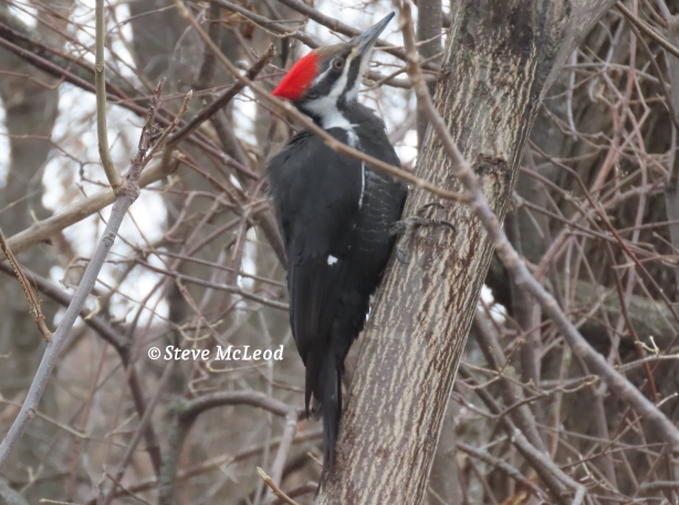 Male Pileated Woodpecker at the suet feeder, female sitting on the walnut tree.